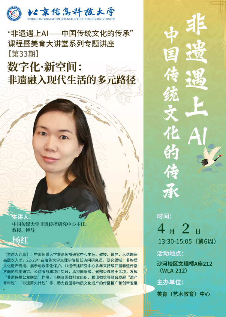 主讲人:杨红 中国传媒大学非遗传播研究中心主任、教授、博导,入选国家高层次人才,22-23年在哈佛大学文理学院担任访问研究员。研究领域:非物质文化遗产传播、展示与数字化保护。