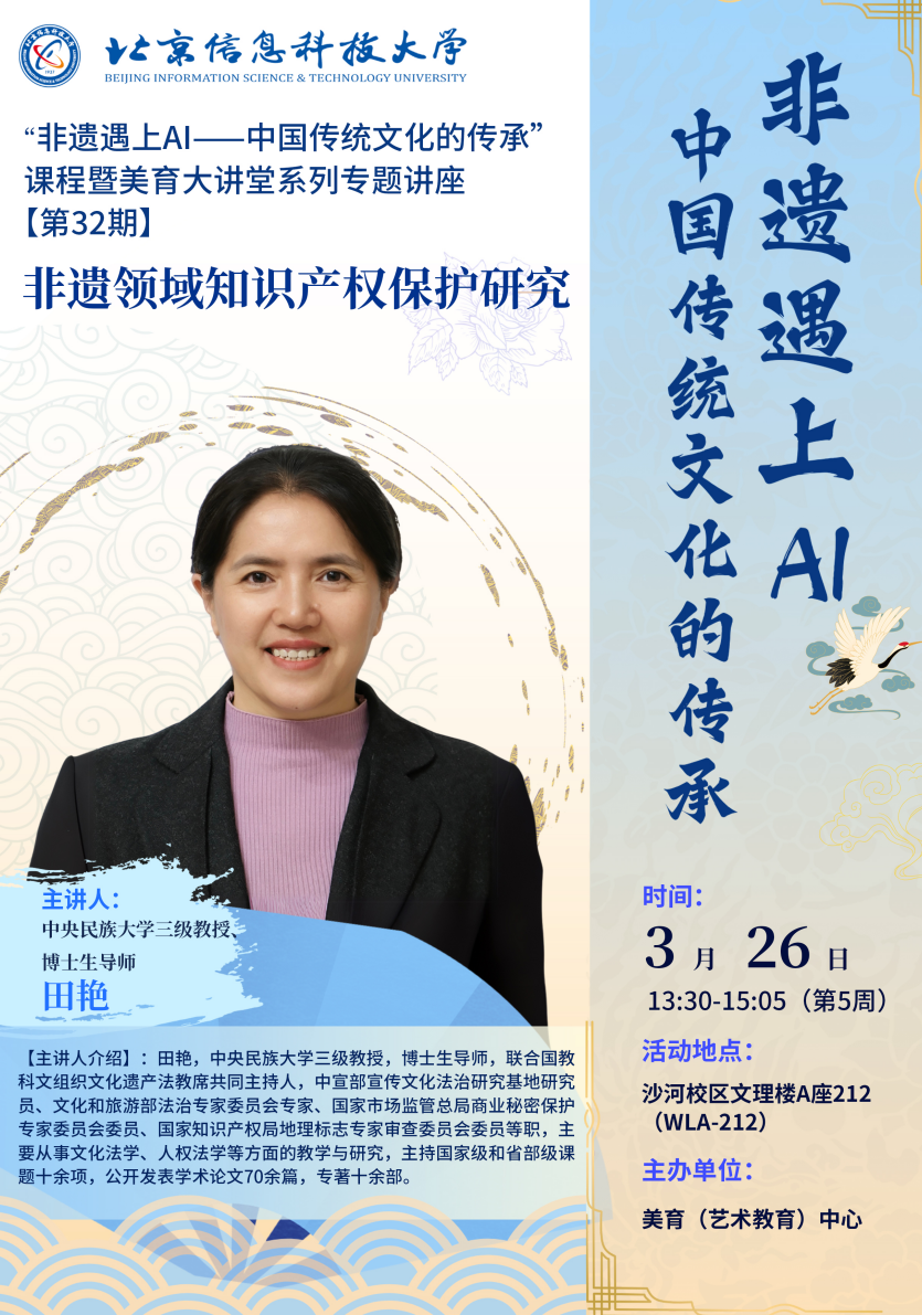 主讲人:田艳 中央民族大学三级教授,博士生导师,联合国教科文组织文化遗产法教席共同主持人