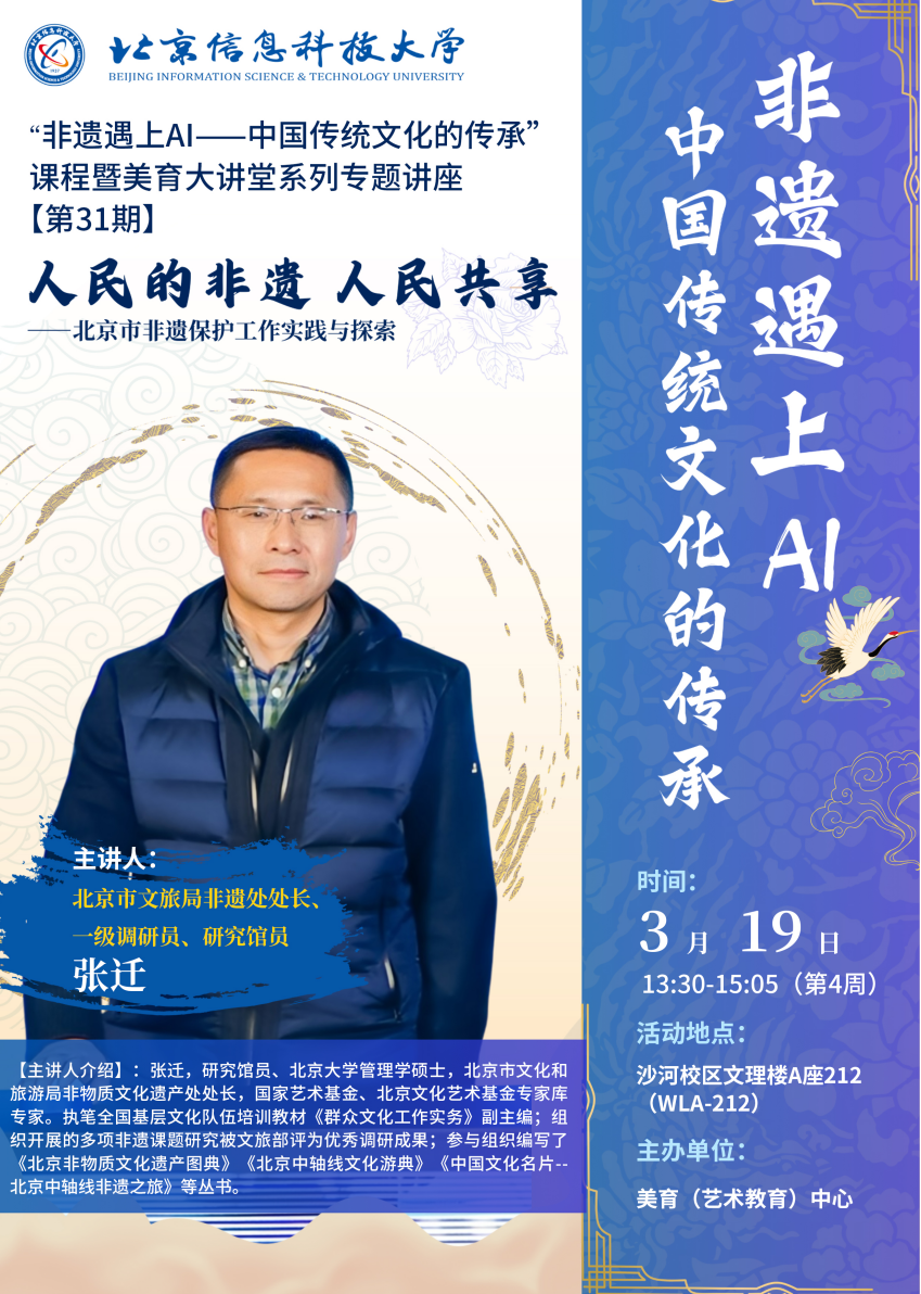 主讲人:张迁 研究馆员,北京大学管理学硕士,北京市文化和旅游局非物质文化遗产处处长,国家艺术基金、北京文化艺术基金专家库专家