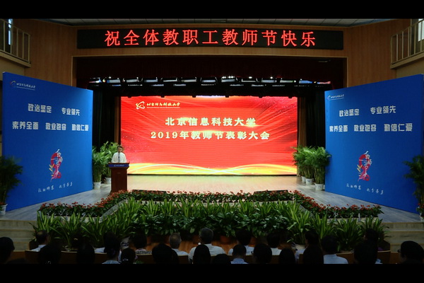 校党委书记王传亮出席大会并讲话。王传亮首先代表学校党委和领导班子,向辛勤耕耘、默默奉献在学校各条战线的全体教师,致以节日的问候,向受到表彰的先进集体和优秀教职工表示热烈的祝贺!王传亮表示,长期以来,学校广大教师以对党和人民教育事业的忠诚、高尚的理想追求、良好的师德修养和深厚的学识,坚守三尺讲台,克服各种困难,将满腔热情倾注在平凡的岗位上,助力学校发展建设取得了优秀的成绩。进入新时代,要实现学校三大历史性任务,过程必然充满艰辛,但要坚信学校的未来发展是大有希望的、前景光明的。王传亮强调,一是要把握发展时机,维护良好态势。学校作为国家队出身、北京市重点支持建设的信息学科较为齐全的高校,学科专业布局与时代发展、国家和北京市战略需求十分契合。近些年来,学校发展呈现良好态势,要倍加珍惜,使之成为大势所趋,势在必得。二是要提升综合实力,塑造整体形象。要坚持目标导向、服务导向、问题导向,聚焦内涵、特色、差异化发展,写好教育“奋进之笔”,持续提升综合实力和核心竞争力,更加注重塑造学校的整体形象。需要广大师生员工参与,利用各种资源,借助新校区建设、聚焦核心竞争力等多种途径,加大宣传力度,形成人人想方设法、个个做出贡献的局面,让信息科大在社会各界当中产生良好的社会反响。三是要奋进新时代,争做好老师。学校的超常规、跨越式发展关键在人才,在广大的教职员工。学校党委将把教师队伍建设作为基础性工作,进一步推进涉及学校发展全局和教职工切身利益的重大问题的解决,进一步增进对教职工情感沟通、人文关怀,让广大教职工工作生活有希望、有奔头,更好地释放创造力。广大教职工要切实做到以德立身、以才立业、以文化人。王传亮希望,全体教职工坚持立德树人,弘扬高尚师德,以强烈的使命感和事业心,积极投身学校的改革发展,努力建设北京信息科技大学更加美好的明天!