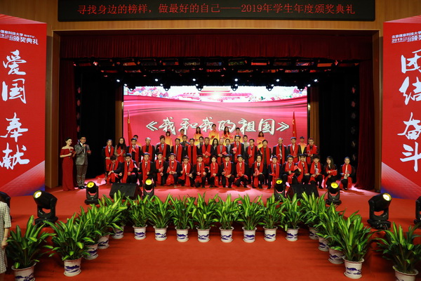 典礼最后,全体师生合唱《我和我的祖国》。校领导与获奖代表合影留念。