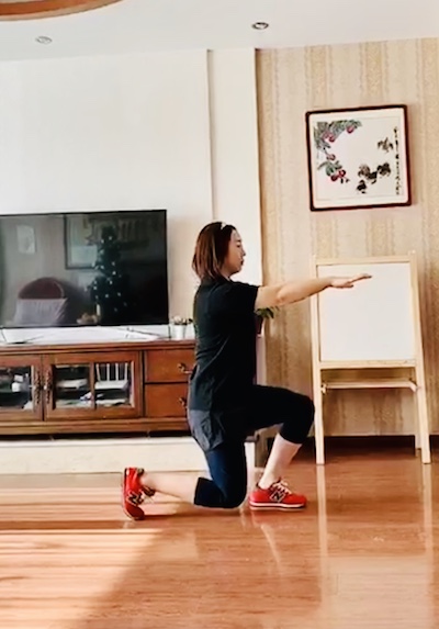 双手平行前伸,掌心向下与肩同宽,双腿前后站立成弓步状态,前侧腿下蹲至90度,后侧腿顺势屈曲,但膝关节不要触碰地面。双侧交替进行,每侧进行10次。