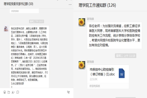 将行动落到实处,紧盯工作细节。面对来势汹汹的疫情和分散各地的教工学生,了解每个人的具体情况成为防控阻击的重点目标。学院依托7个教工党支部,由组织员每日了解全院教师动向并将学校工作部署和要求在线及时传递给大家。通过学院工作通知群、教工党支部工作群、教师个人电子邮箱、一对一短信发布、一对一电话联络等渠道,及时发布防控工作通知、防控常识、信息统计等内容,每日逐项核对师生信息,确保无一信息遗漏、无一人员遗漏。为了确定一名返京教师的具体情况,多次电话联系不上的情况下,院长谢瑞峰直奔这名老师家中,隔着门了解他返京行程和身体状况后又匆匆离去。