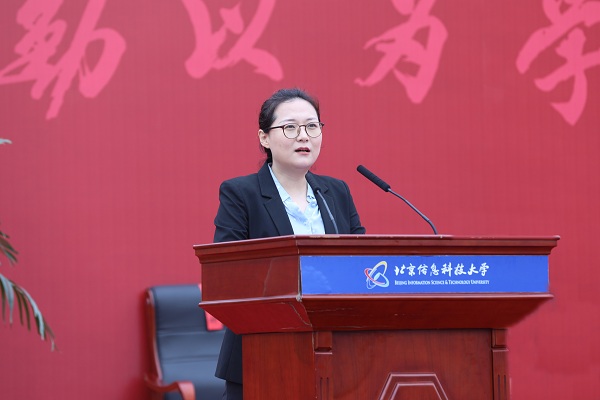 我校理学院教师孙妍作为教师代表发言。她在发言中为2020级新生提出了在大学学习和生活方面的建议,希望同学们尽快适应大学“快节奏”的学习生活,相信老师,严格要求自己,面对学习生活要“不畏惧”,努力成长为更加优秀、更富有时代精神的信息科大人。