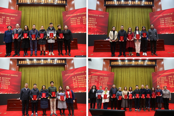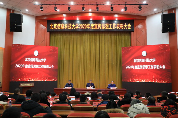 周志成宣读《中共北京信息科技大学委员会关于表彰2020年度宣传思想工作先进单位和先进个人的决定》。大会对教育部“共抗疫情、爱国力行”主题宣传教育和网络文化成果征集展示活动优秀奖、第九届“首都十大教育新闻人物”学校推荐人选、学校阻击新冠肺炎疫情主题作品征集活动、2019年北京高校“双百行动计划”市级优秀项目、2020年北京高校“双百行动计划”校级优秀项目、2020年度新闻宣传先进单位和个人、北京高校师生脱贫攻坚主题社会实践调研校级优秀成果、“使命在肩 奋斗有我”系列主题作品征集活动校级优秀项目、2021年度高校思想政治工作培育建设项目校级优秀项目、2020年基层立项课题校级优秀课题、2020年度北京高校思想政治工作研究课题校级优秀课题、2020年度“学习强国”先进单位、“爱国心、报国情、强国志”强国征文等获奖单位、团队和个人进行了表彰。