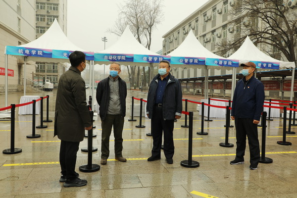 王传亮、王永生随后来到小营校区东门,查看学生返校各项设施,详细了解学生返校报到流程,强调,要坚决做好学生返校的疫情防控工作,严格防控措施,优化服务细节,既要保障返校学生的身体健康和生命安全,又要做到有情感、有温度,让学生们感受到母校大家庭的温暖。