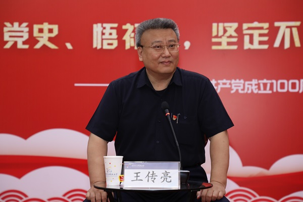 王传亮带领同学们回顾了党的一百年奋斗史,希望广大青年学生从党的光辉成就、艰辛历程、历史经验、优良传统中深刻领悟马克思主义为什么行、中国共产党为什么能、中国特色社会主义为什么好。王传亮强调,立德树人是学校的中心任务,广大青年学生党员要坚定理想信念,攀登专业高峰,全面提升素养,追求高尚境界,创造诗画人生,实现德智体美劳全面发展。他希望全校学生党员持续深入地学好党史,向前辈学习,向英雄学习,做敢奉献、敢斗争,有激情、有责任感的青年人,永远跟党走,不断增强“四个意识”、坚定“四个自信”、做到“两个维护”,自觉刻苦学习,砥砺本领,把个人理想融入到党和国家的伟大事业中,努力奋斗,以优异成绩迎接建党100周年,为中华民族伟大复兴贡献力量!