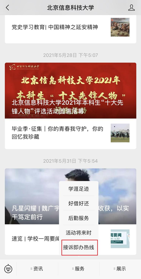 方法三:点击学校官方微信公众号下方“服务”一栏,填写相关信息后提交。