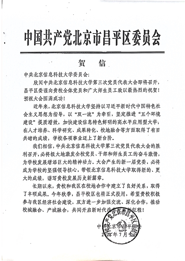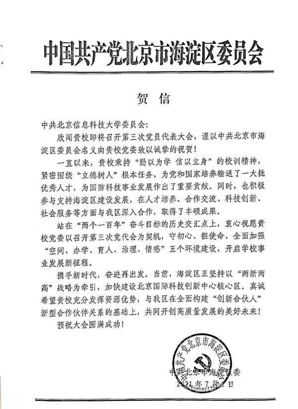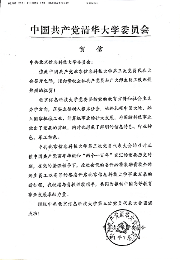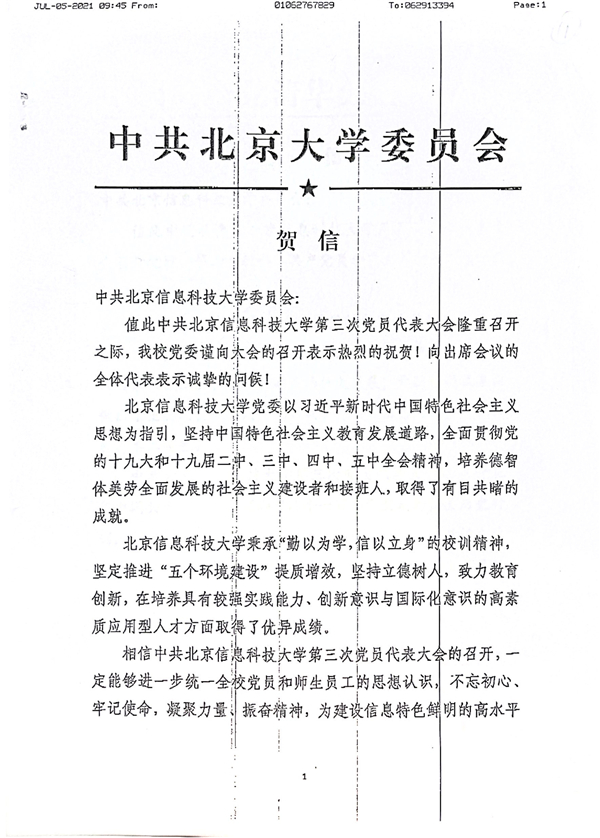 7月6日至8日,我校第三次党代会胜利召开。党代会召开前夕,学校收到北京大学、清华大学、湖南大学、电子科技大学、西安电子科技大学、北京工业大学等82所兄弟院校,中共海淀区委、中共昌平区委等党政机关发来的贺信贺电,祝贺学校第三次党代会胜利召开,预祝大会取得圆满成功!