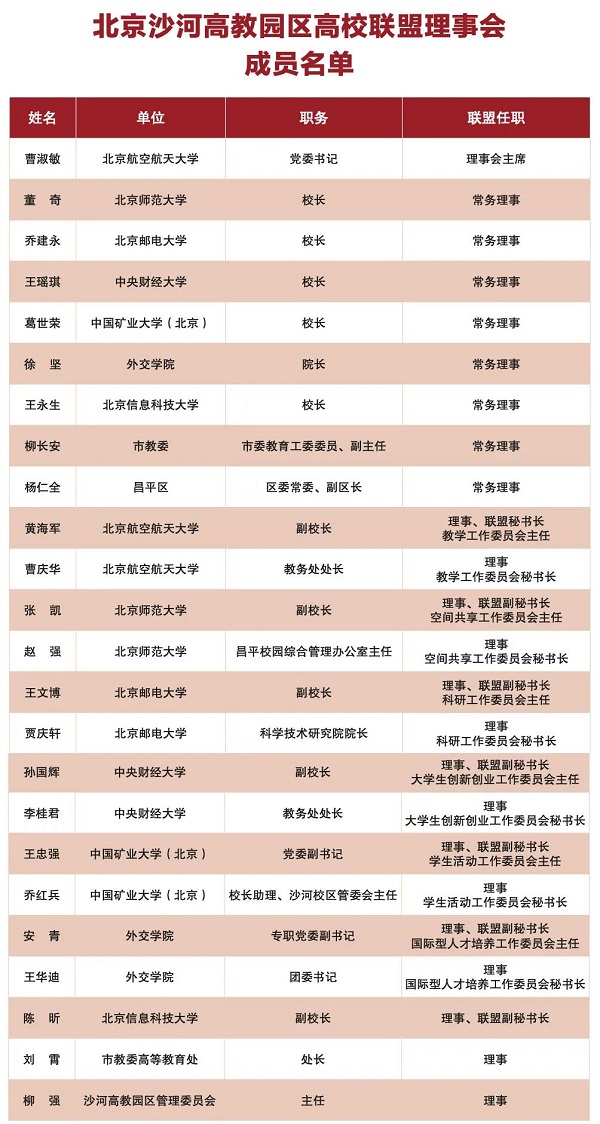理事单位:北京航空航天大学、北京师范大学、北京邮电大学、中央财经大学、中国矿业大学(北京)、外交学院、北京信息科技大学、北京市教委、昌平区政府。