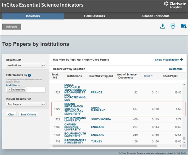 新突破!北京信息科技大学工程学科进入ESI全球排名前1%