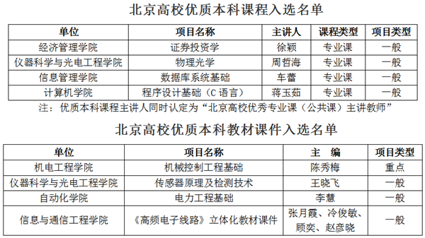 近日,北京市教委公布了2021年北京高校优质本科课程、优质本科教材课件的评选结果。我校申报的8个项目全部入选。其中,《证券投资学》《物理光学》《数据库系统基础》以及《程序设计基础(C语言)》4门课程获北京高校优质本科课程一般项目。《机械控制工程基础》入选北京高校优质本科教材重点项目,《传感器原理及检测技术》《电力工程基础》和《〈高频电子线路〉立体化教材课件》获评北京高校优质本科教材课件一般项目。至此,我校共有12门北京高校优质课程,12部北京高校优质教材课件。