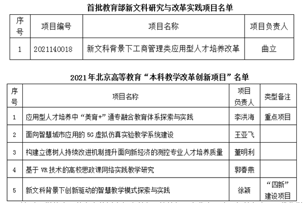 近日,教育部办公厅印发《关于公布首批新文科研究与改革实践项目的通知》,共认定新文科研究与改革实践项目1011个。我校经济管理学院曲立院长牵头的《新文科背景下工商管理类应用型人才培养改革》1个项目成功入选。同时,北京市教育委员会印发《关于公布2021年北京高等教育“本科教学改革创新项目”的通知》,我校共有5项获批立项。