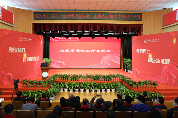 12月3日上午,校党委书记王传亮在小营校区大学生文化艺术中心宣讲党的十九届六中全会精神。学校领导班子成员,各职能部门负责人,各学院书记、院长,教师代表,学生代表等近200人现场听讲。学校师生通过线上直播收听收看。