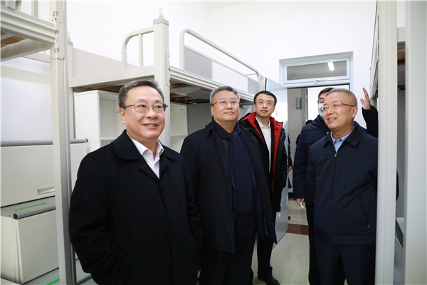 刘宇辉一行在科技广场西侧观看校区平面图,听取新校区一期投用区情况汇报。随后前往学三公寓、二食堂、文理楼,实地查看新校区建设和运行情况,详细询问了解学生住宿、师生餐饮、教育教学等保障情况,同时参观了学校科技成果展和教育教学成果展。