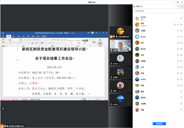 5月25日,学校通过线上方式召开2022年新校区财政资金配套项目建设领导小组会。校党委副书记、校长王永生,副校长方德英,校党委常委、副校长陈昕、叶向忠以及新校区财政资金配套项目建设领导小组全体成员参加会议。会议由方德英主持。