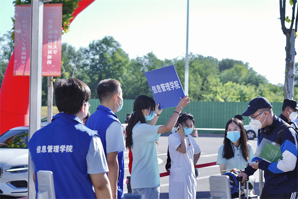 在大兴机场、北京站、北京南站、北京西站、沙河高教园地铁站,学校团委组织的接站志愿者早已翘首以盼。2022级同学乘坐学校安排的大巴车前往各个校区。