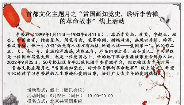 此外,学院还联合西三旗社区青年汇,开展《赏国画知党史 聆听李苦禅的革命故事》线上活动,通过对党员榜样先进事迹学习,进一步认识中国共产党为人民服务的初心,激励引导广大学生立足自身角色、矢志拼搏奋斗。