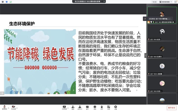 践行低碳生活 创建绿色校园。为贯彻“绿水青山就是金山银山”的绿色发展观,学院开展了“绿色校园创建宣传与实践”主题活动,向党的二十大献礼。同学们以垃圾分类、光盘行动、塑料污染防治科普、生态环境保护志愿公益活动等绿色实践活动为主题,通过线上与线下相结合的方式,大力宣传生态文明建设理念。