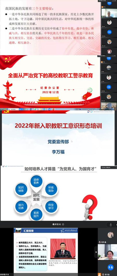 12月23日,党委教师工作部牵头组织开展了以“请党放心·强国有我——树师德,铸师魂”为主题的新入职教职员工师德师风专题培训。培训以线上方式举行,新入职的60余名教职员工参加了此次培训,党委教师工作部副部长兼人事处副处长闫健主持培训会。