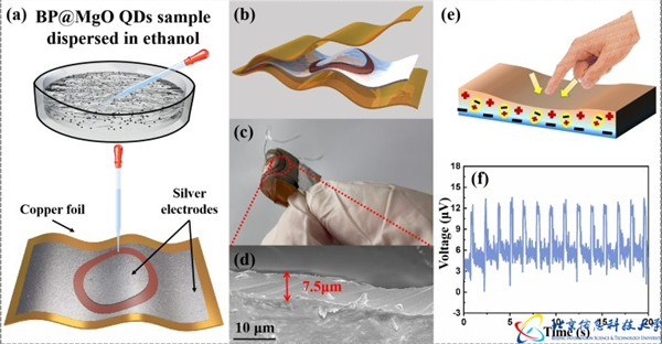 该团队提出了一种Solid-phase–sintering and vapor–liquid–solid生长方法,制备出具有强压电响应的量子氧化物材料——BP@MgO 量子点晶体。该晶体同时具有稳定的晶体结构和高压电响应,可以独立支撑并可与任何器件兼容。团队利用该晶体制备的压力传感器具有较高的压力响应信噪比。通过手指对压力传感器动态施加9-11N的压力,其输出电压图可证明BP@MgO 量子点晶体的压电效应,体现了其在传感器领域的应用潜力。相关成果于2022年11月发表在Journal of Advanced Ceramics期刊上(影响因子11.534,中科院一区TOP期刊),廖擎玮副研究员为论文的第一及共同通讯作者,秦雷研究员为共同通讯作者。