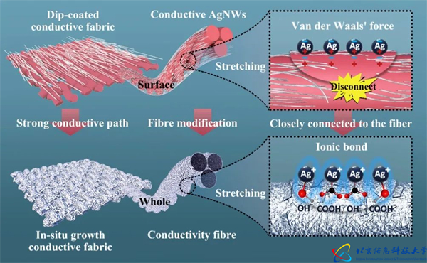 为解决柔性传感器可靠电极制备技术难题,该课题组发展了一种纳米银织物原位生长技术。使得纳米银片与纤维的连接更紧密且不易断开,增加了纳米银片对织物纤维的附着力,最终制得了导电性良好的导电织物,为柔性、可穿戴传感器提供了一种可靠的电极制备手段。相关成果于2022年10月发表在International Journal of Molecular Sciences期刊上(影响因子6.208,TOP期刊),廖擎玮副研究员为本文的第一及共同通讯作者、秦雷研究员为共同通讯作者。