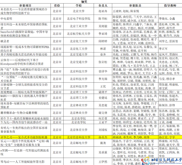 近年来,学校紧扣高水平应用型大学的办学定位和学校创新实践的特色优势,将创新创业教育融入人才培养全过程,与专业教育相结合,信息特色引领全面推进课程思政建设和新工科、新文科建设。构建了基础实践训练、交叉创新研究、创新创业教育分层递进的创新创业教育大平台,通过动手实践、交叉创新、以创促学,促进学生创新创业能力提升和个性化发展,形成实践认证、持续改进、成果导向螺旋式递进的良性循环。2022年,我校在“互联网+”大赛北京赛区比赛中再创佳绩,获得市级一等奖2项,二等奖3项,三等奖33项。自参赛以来,共获得市级以上奖励150项,其中国家级铜奖5项。(供稿/图片:教务处 陈佳男 郑小博 编辑:田驰正 审核:杨静)