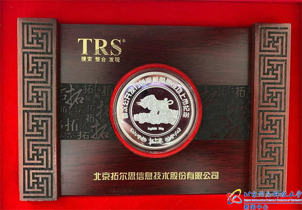 此外,施水才教授还向校史馆捐赠一枚2011年拓尔思上市纪念银币。在学校的办学历史上,非常重视科技成果的产业化工作,拓尔思公司是学校成果转化最早、最成功的案例,使我校成为市属高校首家、也是至今唯一一家拥有上市企业的高校。多年来,拓尔思公司一直关注和支持学校、学生的发展,2008年起便设立了北京信息科技大学“TRS奖学金”,并在实习、就业等领域给与学校大力支持。