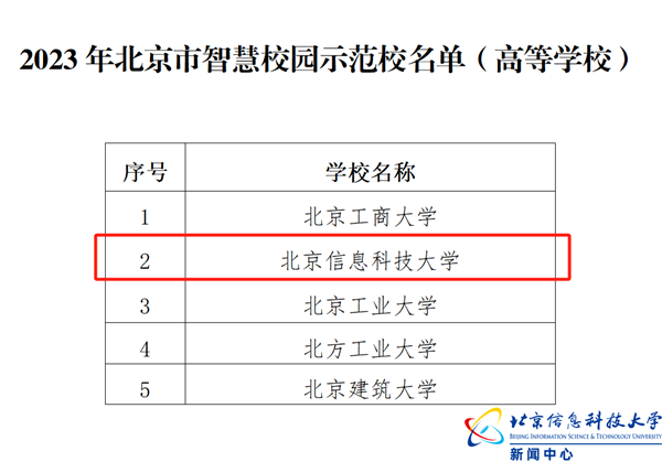 近日,北京市教委公布2023年北京市智慧校园示范校名单,北京市共41所大、中、小学校入选,我校作为入选的5所高校之一名列其中。