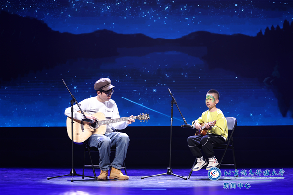 “星星的孩子”和学校学生志愿者共同完成歌曲《童年》弹唱。