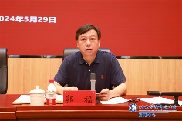 郭福对于英杰来校调研的会议精神进行传达:于英杰对近年来学校事业改革发展取得的成绩给予充分肯定;对新校区二期建设、高水平人才培养、博士点申报建设、张家口校区的建设谋划等具体工作进行了指导,一是做好新校区二期建设相关工作;二是加大高层次人才培养力度,做好博士点申报工作,进一步提升学校办学水平;三是做好高教改革示范园区建设相关工作,理顺建设机制、厘清双方权责。于英杰提出四点希望:一是加强党对学校工作的全面领导;二是全面落实立德树人根本任务;三是锚定国家首都战略需求、服务北京国际科技创新中心建设;四是牢固树立安全发展理念,切实做好学校安全稳定工作。郭福还传达了市委教育工委副书记、市教委主任李奕从学校办学定位、发展方向两方面所作的工作指导。