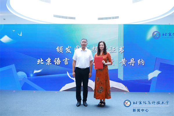 解江凌为北京语言大学黄丹纳副教授颁发图书捐赠证书 。