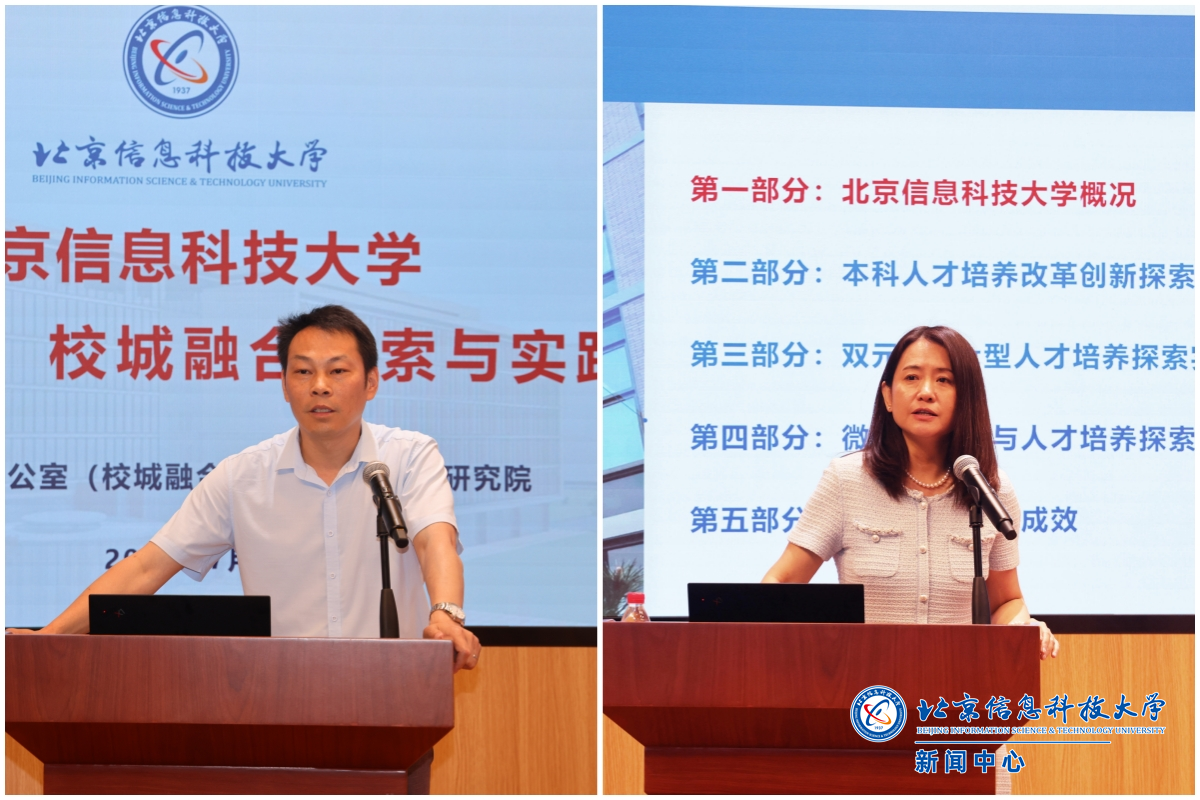 我校产教融合办公室(校城融合办公室)主任程进作题为《北京信息科技大学产教融合、校城融合探索与实践》的专题报告,重点介绍了我校在促进科技成果转化、深化校城融合及产城融合方面的系统性探索、创新机制与实践路径。教务处处长梁旭以《北京信息科技大学特色化人才培养模式探索与实践》为题,系统阐述了我校在本科人才培养方面的改革创新举措,特别是“双元驱动π型人才培养”模式的构建思路与实践成效,以及通过“微专业”建设等途径深化人才培养模式改革、提升人才适应性与竞争力的探索经验。