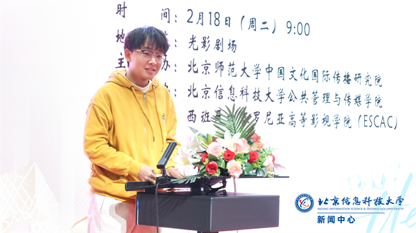 ESCAC讲师、导演阿德里安·胡克森·查帕罗(Adrià Guxens Chaparro)作为外方指导教师代表致辞。他讲述了自己与“看中国”项目的渊源以及该项目对自己人生的深刻影响。他表示要和学生一起,用珍贵的视角去看、去聆听中国、北京和黄会林教授,并通过影像让全世界都看到、听到。