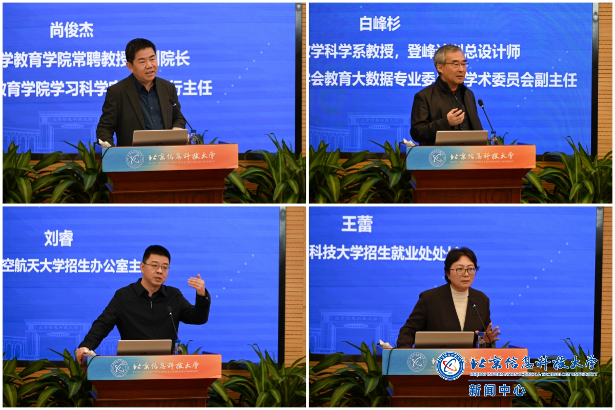 专题报告环节由海淀区教育学会秘书长闫顺林主持。北京大学教育学院常聘教授、副院长尚俊杰以“人工智能和学习科学视野下的学习:学不学,学什么,怎么学?”为题,提出了以学习科学为本、AI技术为用的教育新范式,通过推动学习方式的深层变革,实现更科学、更快乐、更有效的教育。教育大数据专委会学术委员会副主任、清华大学数学科学系教授白峰杉围绕“智能时代的教育:如何在成人与成才之间寻求平衡”,提出智能时代的教育核心在于应对人类“智力外包”的新趋势,在自然属性与社会属性的失配中,重新寻回“成人”与“成才”的平衡。北京航空航天大学招生办公室主任刘睿、北京信息科技大学招生就业处处长王蕾分别围绕“科技变革背景下关于本科招生工作的实践与思考”与“报考决策‘算法’分析——以信息科大为例”进行分享,系统阐述了高校如何响应国家战略与科技变革,通过优化学科布局、创新招生模式和完善培养体系,服务高质量人才培养,并深入解析了基于数据与趋势的科学报考决策方法。