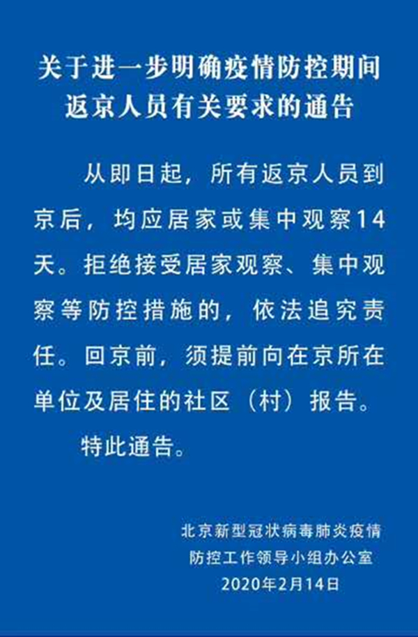 关于进一步明确疫情防控期间返京人员有关要求的通告