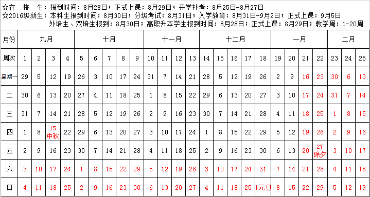 2016-2017(一)学期全日制本科生教学日历