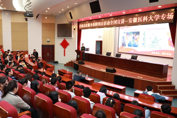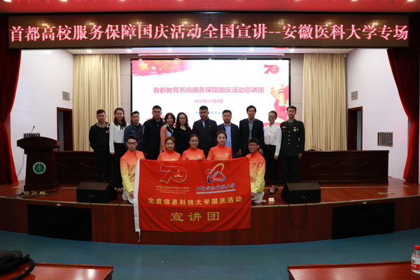 11月8日,由我校10名师生组成的北京信息科技大学国庆精神宣讲团,在校团委书记马绍辉带领下,赴安徽省开展首都教育系统服务保障国庆活动宣讲。8日上午在安徽医科大学进行专场宣讲,下午与中央音乐学院共同在合肥工业大学开展宣讲。中共安徽省委教育工委副书记王佩刚,安徽省教育厅思政处处长林兴德,合肥工业大学党委常委、副校长季益洪,合肥工业大学、安徽医科大学有关部门领导参加了相关活动,合肥工业大学、安徽大学、安徽医科大学等学校学生代表、部分中小学学生代表到场聆听。