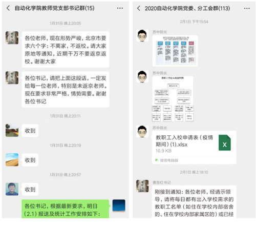 1月23日,学院党委书记、工会主席曹晋红第一时间通过微信群,向全体教职工传达了防控武汉地区发生的新型冠状病毒感染肺炎疫情的会议精神。1月24日,学院成立了专门工作组,更好地应对疫情,部署防控措施。1月25日晚,曹晋红连夜建立“2020自动化学院党委、分工会群”,确保所有的通知精神以及统一部署能够落实到每一位教职工。