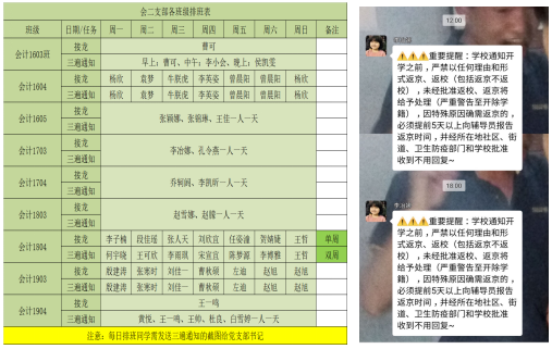 学生党员和积极分子积极监督劝导班级同学遵守学校规定不离家、不返京、不返校。值班党员每天三次转发党委学生工作部(学生处)发布的《关于疫情防控期间瞒报个人信息情况的通报》;每天三次转发学院重要提醒,告知班级同学严禁以任何理由和形式返京、返校;未经批准返校、返京将给予严肃处理等相关规定。