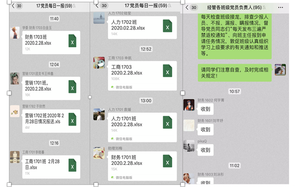 学生党员和积极分子每日进行班级同学身体健康和居住地址报送,主动核查班级每日接龙情况,筛查是否有少报、漏报、瞒报情况;学生党员还第一时间向班主任“报到”,主动承担各自班级健康情况统计和汇报工作,及时了解汇报班级同学疫情防控动态,积极劝导班级同学养成戴口罩、勤洗手、多通风、不聚会、少出行的健康生活习惯等,真正担当起班级防疫工作的直接责任!