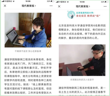 党员朱翠、程星两位老师均身处疫情严重地区,但丝毫没有影响正常教学,他们积极备课,在微信群等公共平台上及时传递网络教学相关信息,发布各种教学资源,回答学生提出的相关问题。为了上好直播课,课前反复调试设备,同时做好了多种应对准备,开学第一天,师生线上交流活跃,教学效果良好。面对疫情,他们始终秉持着坚定乐观的必胜信念,以一名党员的标准严格要求自己,甘于吃苦,体现了新时期教育工作者的美德,其事迹更是被《现代教育报》报道。