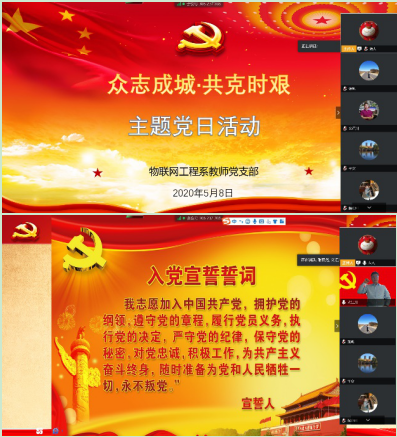 5月8日,党支部召集党员教师开展“众志成城、共克时艰”线上主题党日活动,为新党员文江川举行了线上入党宣誓仪式。面对鲜红党旗,文江川同志高举右手,庄严宣誓;“为共产主义奋斗终身……”,表达了为党的事业奋斗终身的决心和愿望。庄严的宣誓仪式感染着在场的每位同志,这个特殊时期的特殊形式,让在座的党员们一起重温了入党誓词,深深感受到党员的责任、使命、荣耀,明确了以更坚定的信心、更顽强的意志,坚决打赢疫情防控阻击战。
