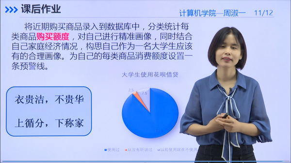 习近平总书记指出,思想政治工作要贯穿教育教学全过程,要用好课堂教学这个主渠道。为进一步推进专业课程与思政教育同向同行,实现全员、全过程、全方位育人,计算中心周淑一紧扣教育的内涵,以课程思政为载体,探索知识传授与价值引领相结合的有效途径,促进教书与育人相统一。下面我们一起看看周淑一是如何将思政元素融入课程教学中的。