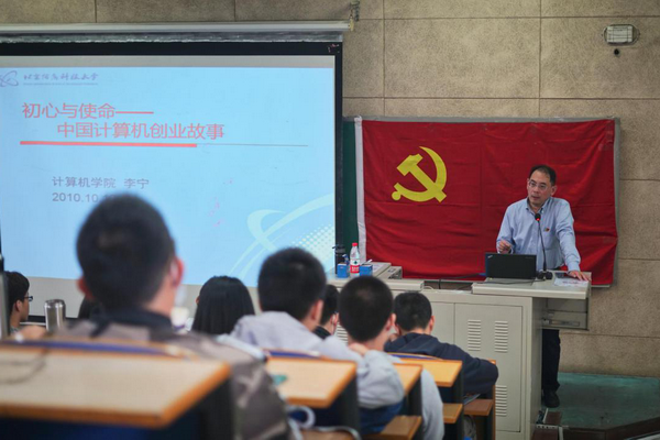 李宁以“初心与使命——中国计算机创业故事”为题,讲述了计算机的发展历史,尤其是我国计算机的发展史。带领同学们领略了我国计算机领域的先驱们不畏艰难、不断开拓进取的风采,感受到中华民族的创新精神,激发了莘莘学子的爱国之心及民族自豪感,激励他们肩负起中华民族伟大复兴的历史使命。