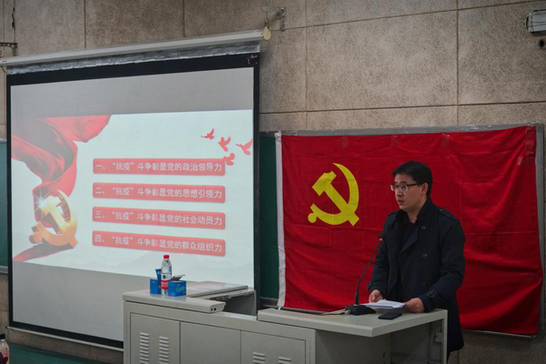 邵飞以“‘抗疫’斗争彰显党的领导力”为题讲授党课。邵飞从“抗疫”斗争彰显党的政治领导力、思想引领力、社会动员力、群众组织力等四个方面讲述了在党的领导下,全国人民万众一心共同抗疫的历程,揭示了中国共产党和人民政府始终把人民的利益放在第一位,从根本上认识到中国共产党是真正为人民谋幸福的政党。邵飞鼓励同学们,明确入党动机,严格要求自己,从爱学校、爱专业,积极发挥自身作用做起,以党员的标准要求自己,投身伟大的事业。