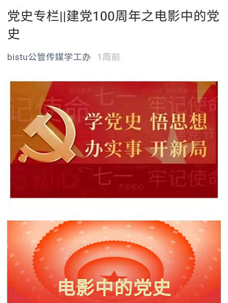 学院新闻中心利用公众号“bistu公管传媒学工办”推出“建党100周年之电影中的党史”文章,开展党史学习教育,介绍《建党伟业》《建国大业》等红色电影,观电影知党史,忆百年峥嵘岁月。