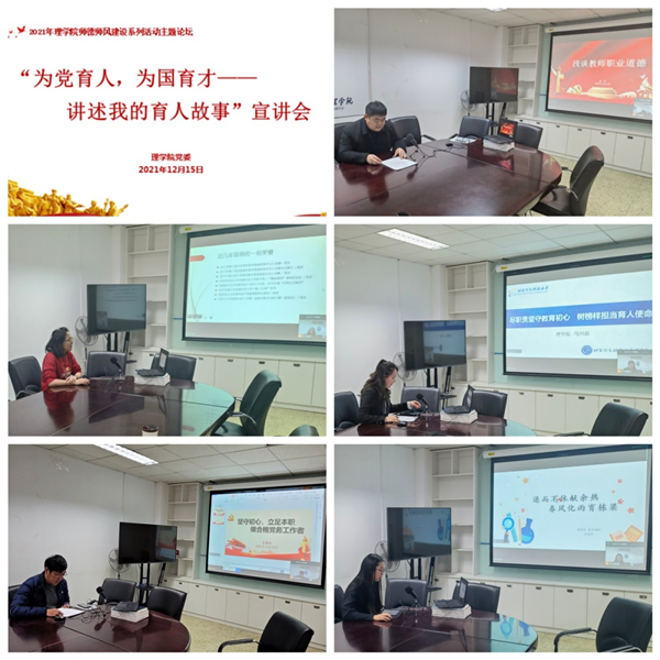 12月15日,理学院党委以线上形式举办“为党育人、为国育才——讲述我的育人故事”宣讲会。本次活动是学院2021年师德建设系列活动的主题论坛环节,学院全体教师参加。活动由学院党委书记韩光主持。