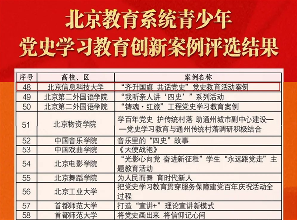 近日,北京市委教育工委公布了北京教育系统青少年党史学习教育创新案例评选结果,我校“齐升国旗 共话党史”党史教育活动案例入选百篇获奖案例。