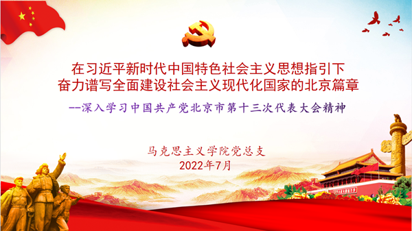 为深入学习贯彻北京市第十三次党代会精神,切实把师生党员的思想、行动统一到大会精神上来,暑期,马克思主义学院党总支组织各党支部开展了“深入学习北京市第十三次党代会精神”主题党日活动。本次活动中,各党支部书记带头在所在支部讲专题党课,并组织了专题学习研讨活动,确保全体师生全面把握精神实质,深刻领会核心要义,并将学习收获自觉转化为实际行动。